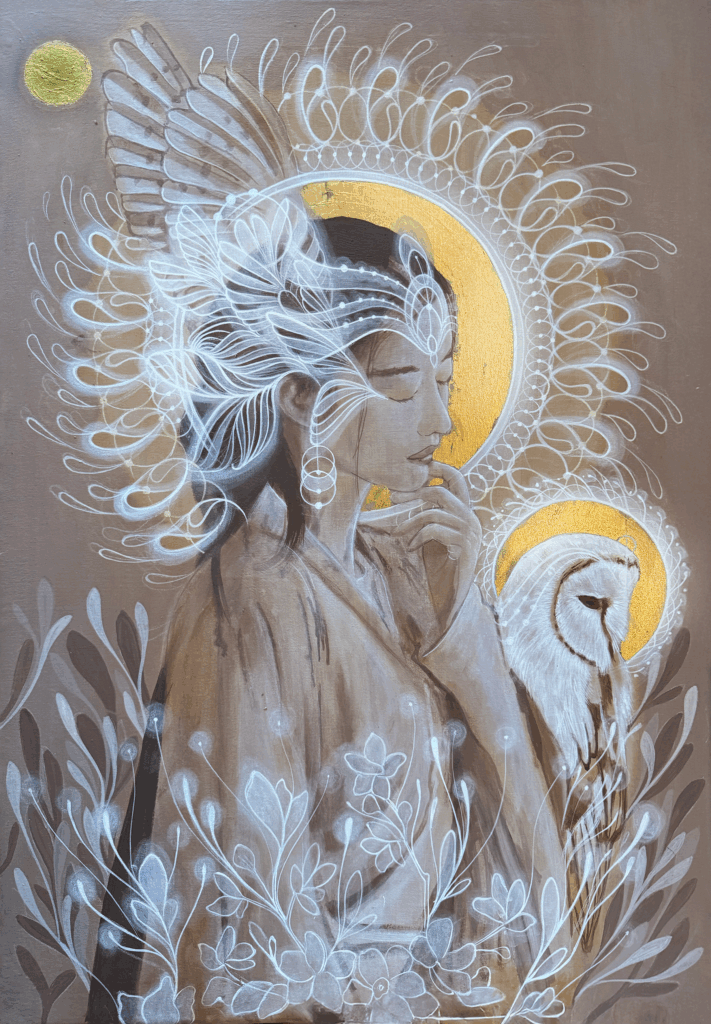 This piece embodies a solar goddess who radiates presence—not as a distant icon, but as a luminous center of inner wisdom. Surrounded by geometric weaves and accompanied by owl-spirits, the figure does not watch—she listens. Her silence is vibration that arranges. Inspired by solar mythologies and cross-cultural symbols, the piece becomes a contemporary altar where the feminine appears as nourishing clarity. “Wisdom” does not teach—it reveals. A symphony where light becomes a form of understanding.